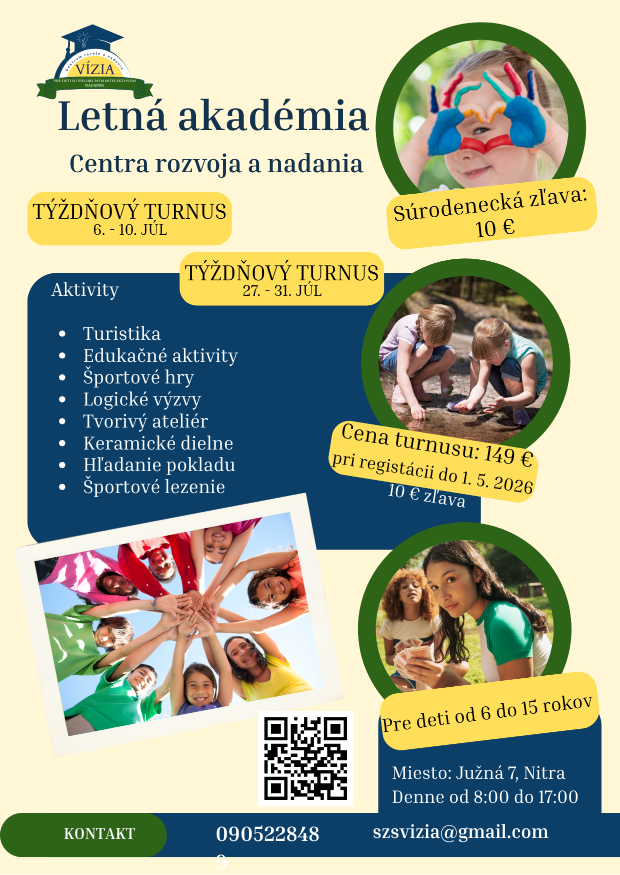 Letná akadémia Centra rozvoja a nadania VÍZIA je vzdelávací a rozvojový tábor pre deti vo veku 6 až 15 rokov, ktorý vytvára podnetné, bezpečné a inkluzívne prostredie pre ich prirodzený rast a napredovanie. Program je určený pre všetky deti, vrátane detí zo sociálne znevýhodneného prostredia.